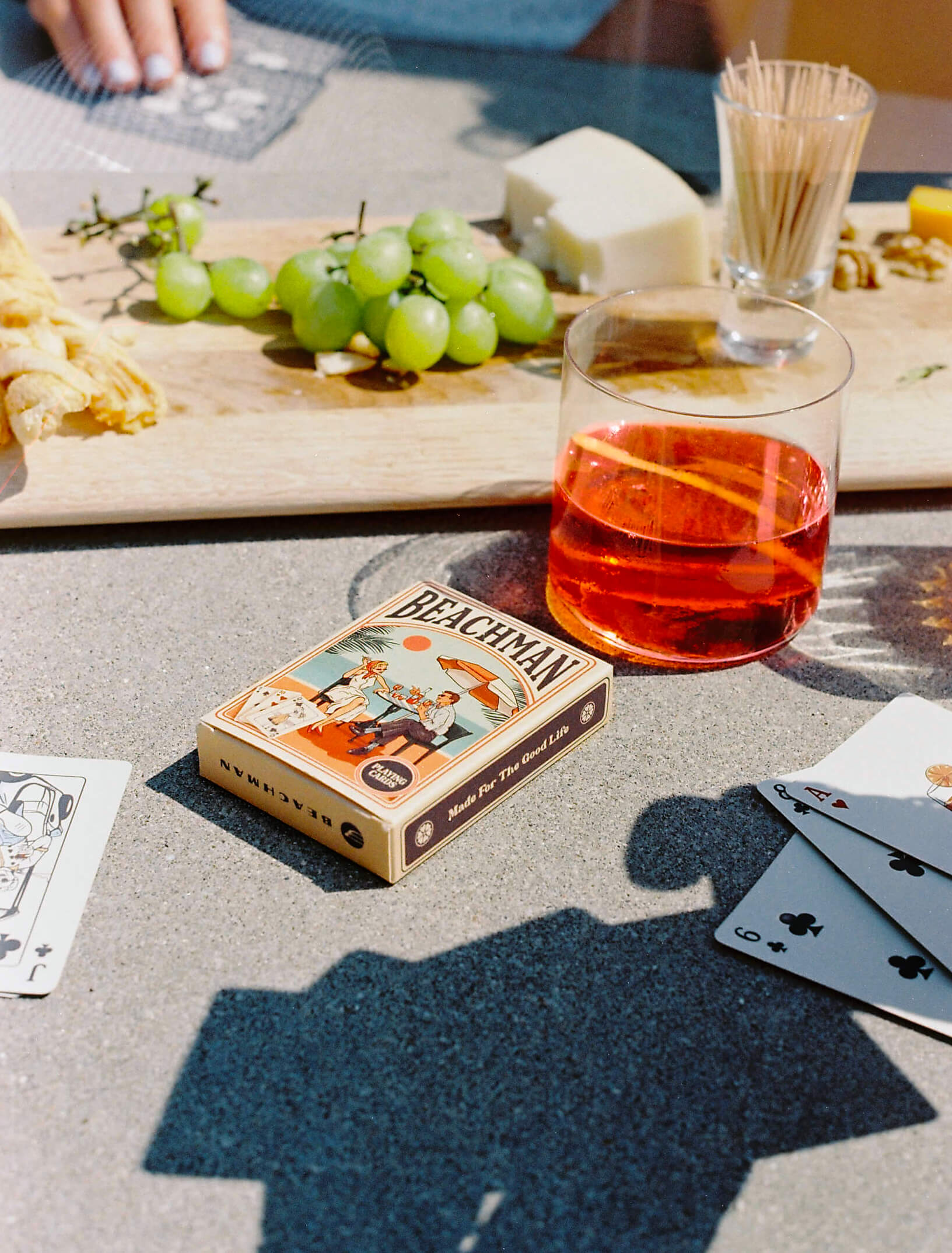 When I think about leisure, for me it always comes down to playing cards by the water. It’s something my friends and I have done for decades, and this deck honors that tradition. A time and place I call the Banter Hour, when all you have to do that day is drink Campari & soda and tell jokes over a game of euchre. This deck was designed to be at home during those moments, featuring art designed around 4 classic cocktails and Beachman settings, as well as some hidden easter eggs for those with attention to detail.