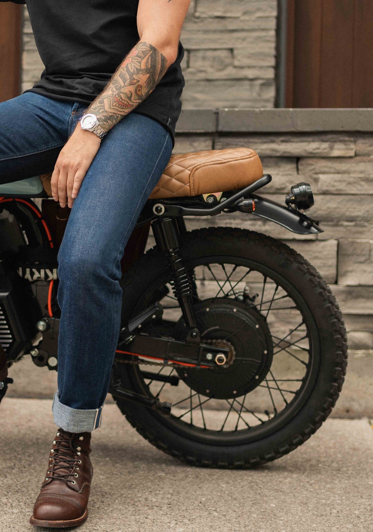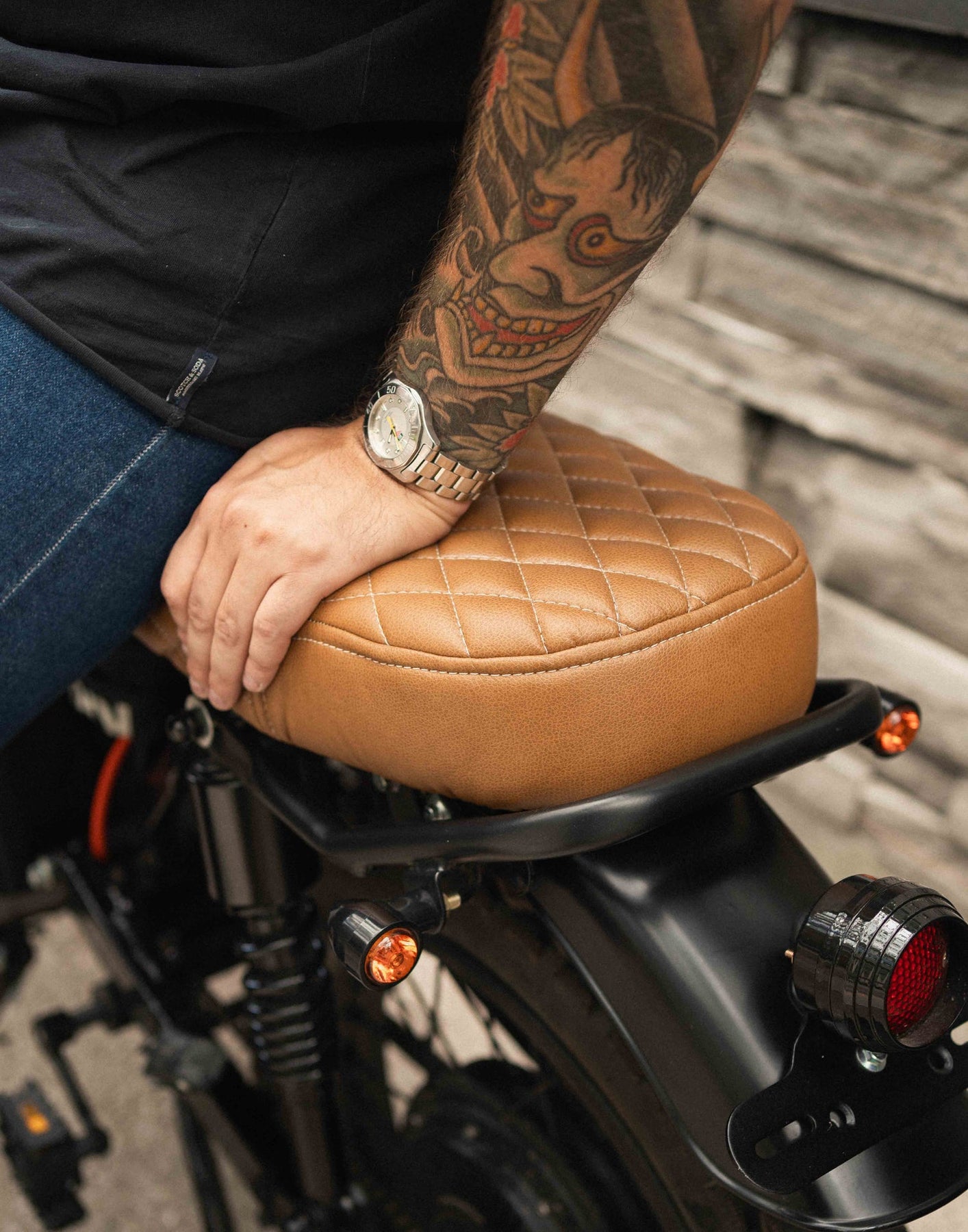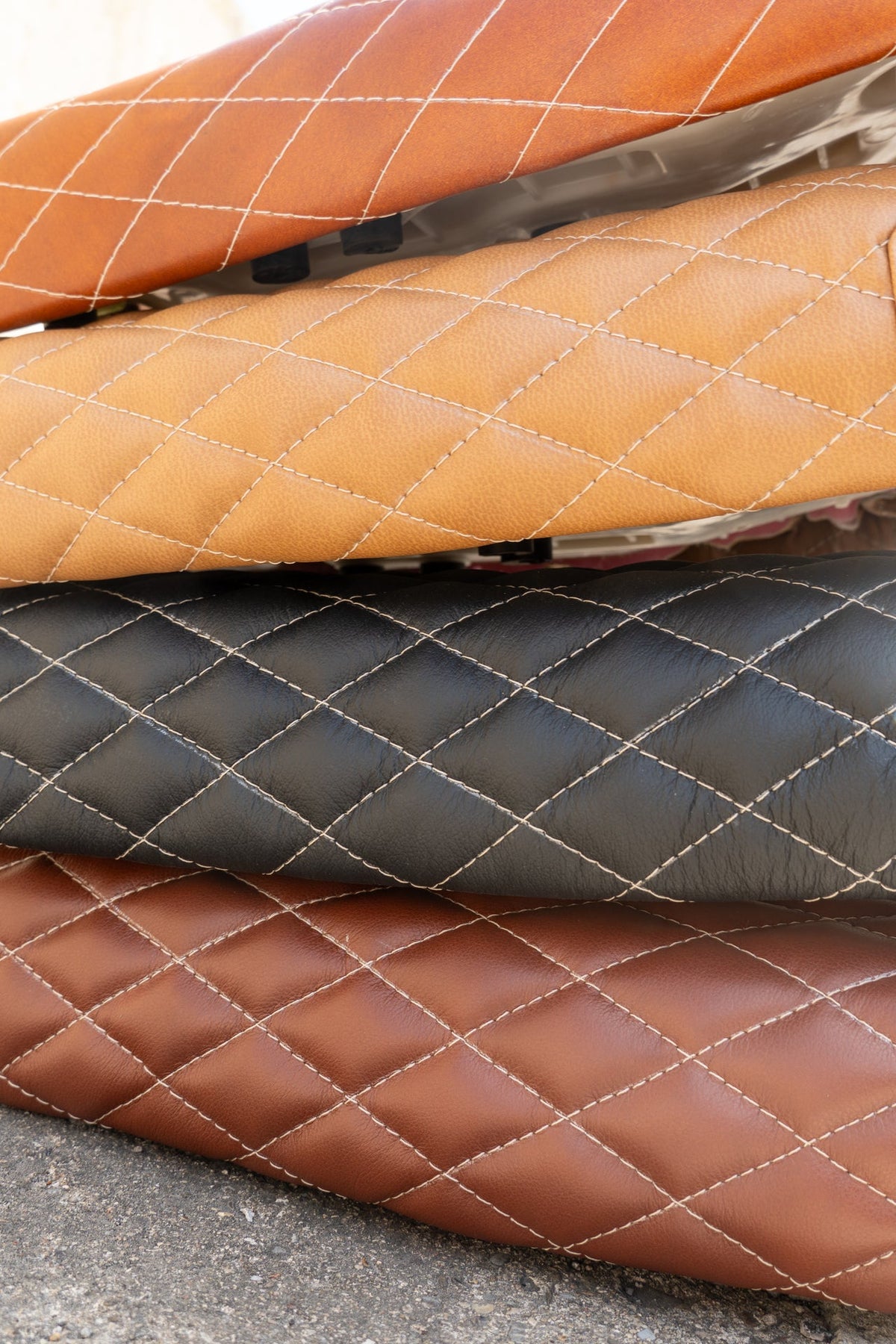 While leather looks the best, vinyl is recommended if you plan on riding in the rain, as leather seats retain water and can stay moist for a day or so afterward.