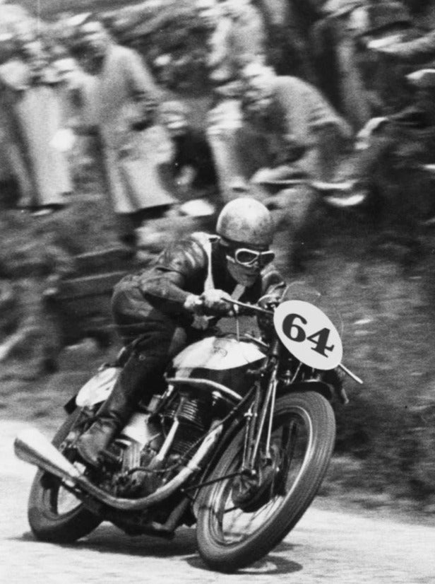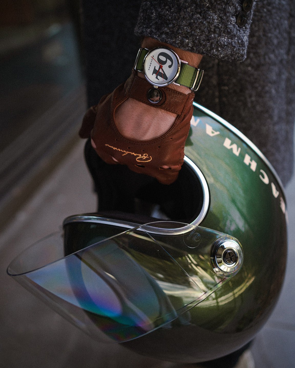 Designed as an homage to our ‘64 café racer, the face resembles the prominent black-and-white circular racing numbers featured on the side panels of racing bikes in the 1960's and 1970's.