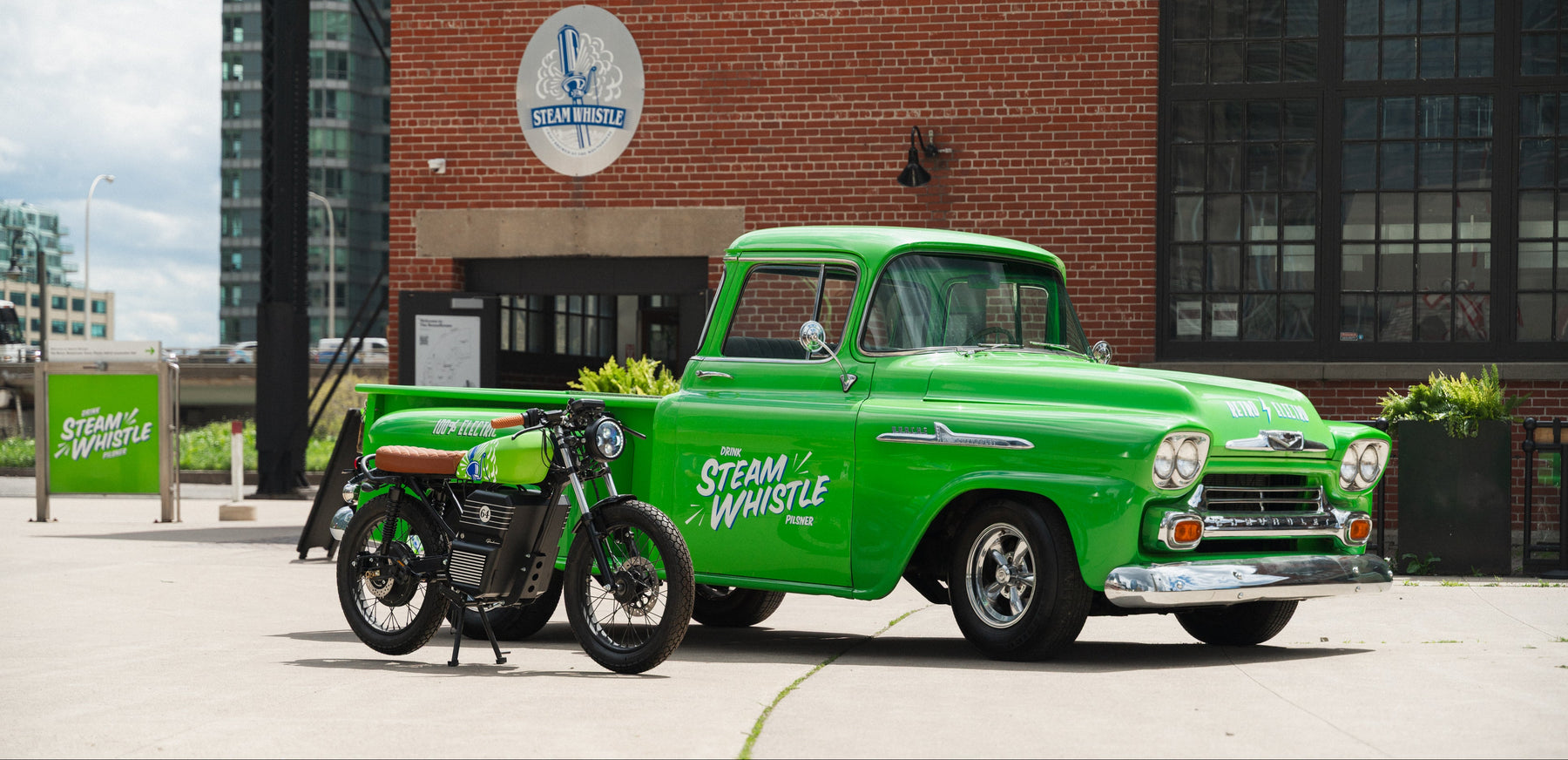Retro Electro — A custom commercial build for our good friends (and fine beer folks) at Steam Whistle. This electric classic features an upcycled motor and 24kWh battery from a 2017 Nissan Leaf, managed by a Resolve EV controller. Outfitted with a Tesla iBooster brake conversion and Prius power steering, it’s smooth, responsive, and built for city cruising. Top speed: 150 km/h. We also built a custom branded '64 e-bike to fit in the truck bed.