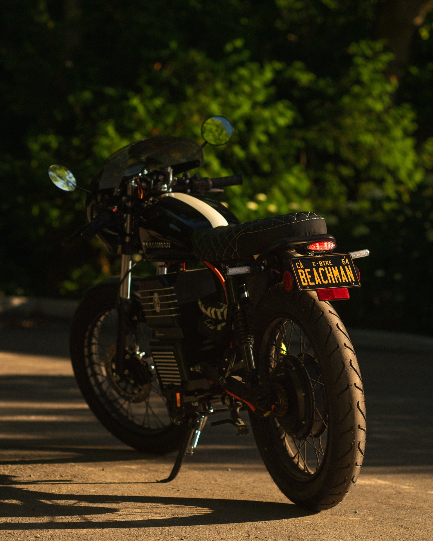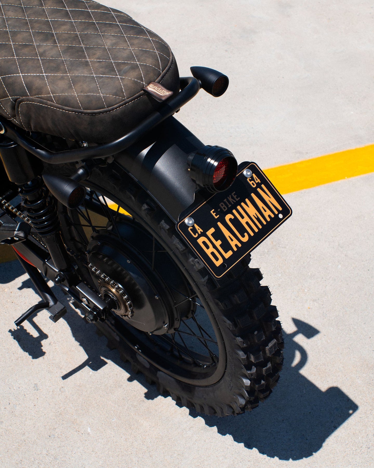 Stamped in steel and inspired by classic California motorcycle plates, it features bold embossed lettering, a matte black finish, and golden detailing. Designed to fit all Beachman models and clearly marked for E-Bike use, it's the perfect blend of form and function.