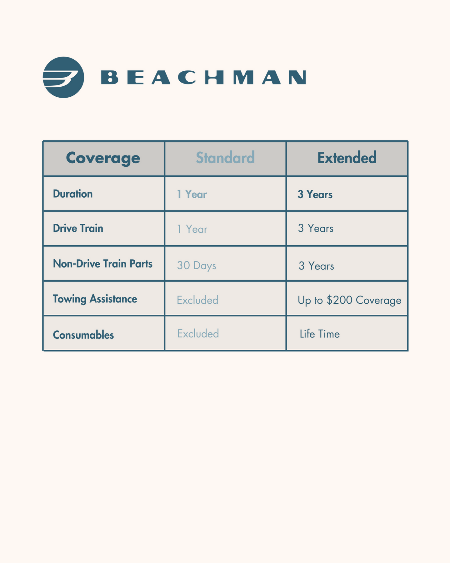 Every Beachman comest with a standard 1-year warranty that covers the drivetrain for the first year of use. By purchasing this Extended Warranty, you’ll extend your drivetrain protection to 3 years and gain several additional perks and coverages.